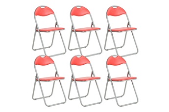 Lot de 6 Chaises Rouges Patty Une chaise pliable extrêmement pratique qui prend très peu de place une fois son utilisation terminée. Dispose également d'une poignée pour une meilleure mobilité. Piètement en métal gris. Assise et dossier en PVC rouge. Hauteur d'assise : 45 cm. Dimensions : 44 x 45 x H79 cm