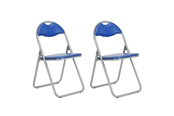 Lot de 2 Chaises Bleues Patty Une chaise pliable extrêmement pratique qui prend très peu de place une fois son utilisation terminée. Dispose également d'une poignée pour une meilleure mobilité. Piètement en métal gris. Assise et dossier en PVC bleu. Hauteur d'assise : 45 cm. Dimensions : 44 x 45 x H79 cm