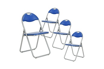 Lot de 4 Chaises Bleues Patty Une chaise pliable extrêmement pratique qui prend très peu de place une fois son utilisation terminée. Dispose également d'une poignée pour une meilleure mobilité. Piètement en métal gris. Assise et dossier en PVC bleu. Hauteur d'assise : 45 cm. Dimensions : 44 x 45 x H79 cm
