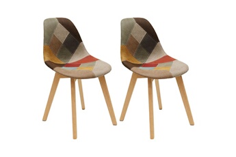 Lot de 2 chaises patchwork motif vintage bradu. Un produit idéal pour donner à votre intérieur une touche originale. en plus de son revêtement tissu à motif patchwork multicolo... Style scandinave, couleur principale du lot de 2 chaises : multicolore et marron clair Dimensions totales : 47 x 55 x 84 cm (lxpxh) . Poids du produit : 10kg Article lot de 2 chaises qui nécessite un assemblage.