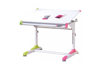 Color's a tout ce dont un bureau pour enfant a besoin. Réglable facilement en hauteur avec sécurité enfant. Tablette blanche, inclinable, avec décors roses ou verts au choix ! Structure en métal blanc. Plateaux en MDF blanc. Inclinaison réglable. Destiné à un usage privé uniquement. Dimensions : 100 x 66 x H69/84 cm