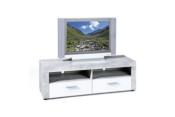 Meuble tv moderne couleur béton avec une façade blanche. Ce meuble est assez large pour un grand ... Style contemporain, couleur Dimensions : long: 134 cm, prof: 42 cm, haut: 43 cm