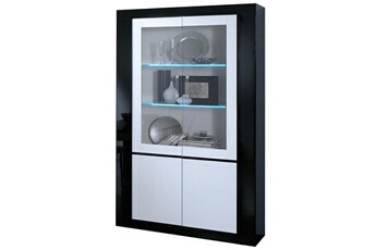 Vitrine 2 Portes Victoria. D'une rare élégance, cette vitrine mise sur une composition de couleur noire et blanche, combinée à une porte et des tablettes en verre, sublimées par un éclairage Led inclus. Misez sur une ambiance épurée et sophistiquée avec le reste des meubles de la serie Victoria. Sa grande capacité de stockage vous permettra d'entreposer l'essentiels de vos objets à l'abri. Structure panneaux de particules, finition laqué noir et blanc brillant. Plateau en panneaux de particules, tablettes en verre. Eclairage Led intégré. Dimensions : 114 x 43,5 x H195 cm