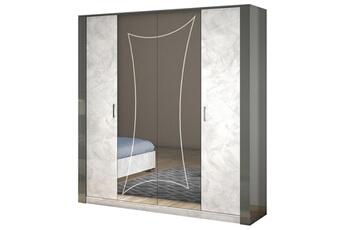 Armoire 4 Portes Ombeline. Derrière ses grandes portes se cachent une penderie ainsi qu'un grand espace de rangement. Avec sa façade effet marbre clair et ses grands miroirs, cette armoire trouvera aisément sa place dans votre chambre. Structure en panneaux de particules, revêtement décor gris. Finition laqué brillant. Revêtement façade décor effet marbre clair. Portes-miroir avec motif intégré. Poignées chromées. Dimensions : 184,7 x 59 x H210 cm