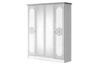 Armoire 4 Portes Solaya Une armoire élégante et ergonomique. Derrière ses portes se dissimule un large espace de rangement. Le côté droit a 3 tablettes pour le linge. Le côté gauche a une tablette supérieure, ainsi qu'une penderie pour y disposer vos habits. Stucture en panneaux de particules Ep. 18mm, revêtement en mélaminé blanc brillant. Champs et Corniche en mélaminé gris. 2 portes en panneaux de particules Ep. 18mm, revêtement en mélaminé blanc, champs en mélaminé gris, motif arabesque sérigraphié argenté et 2 portes miroirs. Dos en MDF. Poignées métalliques. Côté droit : 3 tablettes de rangement. Côté gauche : 1 tablette supérieure + 1 penderie. Dimensions : 160 x 51 x H210 cm
