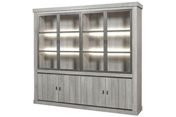 Bibliothèque 8 Portes Massyle. Un meuble disposant d'une importante capacité de rangement, répartie entre les étagères sous portes vitrées en haut, et celles dissimulées par les portes pleines. Parfait pour recevoir livre, accessoires et autres objets de collection. Structure en panneau de particules, finition aspect bois grisé. Portes et tiroirs avec système Softclose. Portes vitrées. Eclairage inclus. Dimensions : 248 x 48 x H226 cm