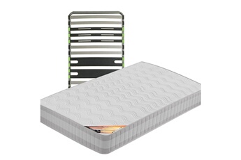 Ensemble composé d'un matelas tahiti 90x190cm et d'un cadre à lattes altozone 90x190cm. prévu pour un couchage quotidien, ce matelas bénéficie d'un confort semi-ferme qui permet... Couleur : blanc Dimensions totales : 190 x 90 cm. Poids du produit : 24.1kg Matelas composé d'une couche de 16 cm de mousse aertech. Pour une densité de 30kg/m3, une house matelassé et fixe en tissu jacquard recouvre cette mousse. Rembourré en coton et ...
