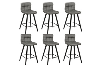Lot de 6 Tabourets Gris Soren Un tabouret élégant avec son piètement en bois massif et son assise moderne avec dossier confortable. Parfait pour un coin cuisine ou pour aller avec votre bar. Piètement en frêne, finition laqué anthracite. Support et repose-pieds en métal laqué noir. Embouts de pieds réglables. Assise garnie de mousse polypropylène de densité 30kg/m3. Revêtement assise et dossier en simili gris. Hauteur d'assise : 65 cm. Dimensions : 39 x 43 x H91 cm