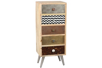 Chiffonnier 5 Tiroirs Razon. Haut en couleur et ergonomique, ce meuble vous propose 5 tiroirs de rangement, sur un meuble vertical pour conserver un maximum d'espace. Envie d'originalité dans votre intérieur ? Soyez sûr de faire mouche avec la gamme Razon riche en couleurs et en motifs. Structure et tiroirs en palissandre, finition vernis nitro-cellulosique. Façade porte et tiroir en acier structuré décoratif. Pieds démontés. Dimensions : 45 x 35 x H110 cm. Bois issu de la gestion contrôlée des forêts.