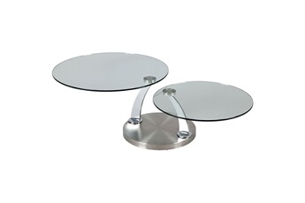 Table Basse Ronde Vanda. Avec ses deux plateaux pivotants indépendants, cette table basse apportera un charme indéniable à votre salon, et pourra s'ouvrir et se fermer à loisir en fonction de vos besoins. Piètement en acier brossé. Montant en acier chromé. Plateaux en verre trempé ép. 12mm. Dimensions Pied : 80-136 x 80 x H41,5 cm Dimensions Plateau n°1 : Ø80 x H1,2 cm Dimensions Plateau n°2 : Ø60 x H1,2 cm