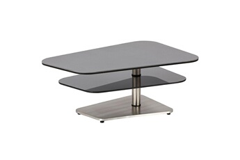 Table Basse Typhaine. Proposant un aspect design et actuelle, cette table basse possède 2 plateaux pivotant changeant des formes que l'on a l'habitude de voir. Son aspect intriguera vos convives et apportera une touche de modernité dans votre salon. Pied en acier brossé. Plateaux en verrre fumé gris ép. 12mm. Surface plateau finition céramique gris anthracite. ép. 12mm. Dimensions : 100-112,5 x 65-85 x H39,5 cm