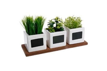 Nombre de modèles : Basilic - Ciboulette - Persil - Poids : 1.58 kg - Matière : Bois grès et plastique - Dimensions : L. 34 x l. 15 x H. 15 cmPot céramique : L. 9 5 x l. 9 x H. 8 5 cmPlateau bois : L. 34 x l. 12 x H. 1 2 cm