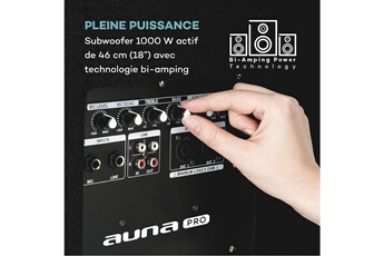 Subwoofer sono actif avec une taille de 18" (46 cm) et une puissance de sortie de1000 Watt (500 W x  2x250 W).Son puissant : Technologie bi-amping Dynamic Driver 18" (46 cm) effet écho pour microphone ainsi que régleur de basses et treble.Branchement confortable sur toutes les sources de musique c