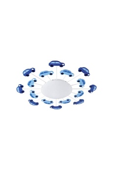 Applique Viki 1, un rond-point pour la chambre d’enfant L’applique Viki 1 est la source lumineuse idéale pour la chambre d’enfant. Les petites voitures bleues montées autour du corps rond attirent tous les regards. Le corps en verre satiné assure une distribution homogène de la lumière sans éblouir. De cette manière, on bénéficie d’un éclairage agréable pour la salle de jeu.