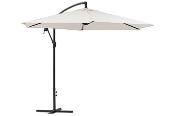 Parasol jardin déporté - Rond - Aluminium - Ø 3 m - Écru- Toile polyester 160 gr/m² Descriptif : Parasol jardin déporté Ilios - Structure en aluminium qui résiste à la corrosion - Toile en polyester, traitée anti-UV - Pour un confort idéal, vous avez la possibilité de régler la hauteur de votre parasol, son angle d'inclinaison (avec la poignée/manivelle) et sa rotation jusqu'à 360° - Afin de conserver votre parasol le plus longtemps possible, n'hésitez pas à le fermer lorsque vous ne l'utilisez pas et à le ranger à l'abri dans un endroit sec et/ou sous une housse de protection. Couleur Toile : Ecru. Mât : Gris foncé. Baleines : Gris foncé. Matière Toile : Polyester - Densité 160gr/m². Structure : Aluminium. Socle : Aluminium. Dimensions Parasol : Ouvert : 3 x 3 x 2.6 m - Fermé : 0.4 x 0.2 x 2.3 m. Toile : Ø 3 m. Mât : Ø 48 mm - Hauteur : 175 cm. Baleines : 6 Baleines - Acier. Socle : Pied en croix - 90 x 90 x 5 cm. Le + Produit : - Inclinable et rabattable - Déperlant - Anti-UV - Anti