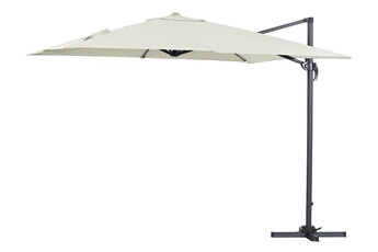 Parasol jardin déporté - Structure aluminium - 3 x 3 m - Ecru - Toile polyester 220 gr/m2. Pied non inclus. Descriptif : Parasol jardin déporté Sun 3 - Structure en aluminium qui résiste à la corrosion - Toile en polyester 220g/m², traitée anti-UV - Pour un confort idéal, vous avez la possibilité de régler la hauteur de votre parasol, son angle d'inclinaison (avec la poignée/manivelle) et sa rotation jusqu'à 360° (avec la pédale) - Afin de conserver votre parasol le plus longtemps possible, n'hésitez pas à le fermer lorsque vous ne l'utilisez pas et à le ranger à l'abri dans un endroit sec et/ou sous une housse de protection. Couleur Toile : Ecru. Mât : Gris. Baleines : Gris. Matière Toile : Polyester - Densité 220gr/m². Structure : Aluminium. Socle : Aluminium. Dimensions Parasol : Ouvert : 3 x 3 x 2.9 m - Fermé : 0.4 x 0..3 x 2.6 m. Toile : 3 x 3 m. Mât : 48 x 58 mm - Hauteur : 250 cm. Baleines : 8 Baleines - Epaisseur 1 mm. Socle : 100 x 100 x 6 cm (En croix) (Dalles sur la photo