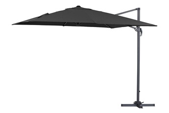 Parasol jardin déporté - Structure aluminium - 3 x 3 m - Noir- Toile polyester 220 gr/m2. Pied non inclus. Descriptif : Parasol jardin déporté Sun 3 - Structure en aluminium qui résiste à la corrosion - Toile en polyester 220g/m2, traitée anti-UV - Pour un confort idéal, vous avez la possibilité de régler la hauteur de votre parasol, son angle d'inclinaison (avec la poignée/manivelle) et sa rotation jusqu'à 360° (avec la pédale) - Afin de conserver votre parasol le plus longtemps possible, n'hésitez pas à le fermer lorsque vous ne l'utilisez pas et à le ranger à l'abri dans un endroit sec et/ou sous une housse de protection. Couleur Toile : Noir. Mât : Gris. Baleines : Gris. Matière Toile : Polyester - Densité 220gr/m². Structure : Aluminium. Socle : Aluminium. Dimensions Parasol : Ouvert : 3 x 3 x 2.9 m - Fermé : 0.4 x 0..3 x 2.6 m. Toile : 3 x 3 m. Mât : 48 x 58 mm - Hauteur : 250 cm. Baleines : 8 Baleines - Epaisseur 1 mm. Socle : 100 x 100 x 6 cm (En croix). Le + Produit :