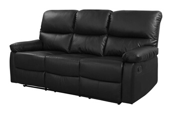 Canapé relax 3 places "Lincoln" - Noir - Dimensions : 197 x 89 x 103 cm - Revêtement en PU et en tissu - Rembourrage mousse et polyester Type : Relax. Couleur : Noir. Nombre de places : 3 places. Matière Canapé : PVC - 230g/m². Dossier : Rembourrage mousse 25 kg/m3. Assise : Rembourrage mousse 25 kg/m3. Structure : Bois, contreplaqué et mécanisme en métal. Suspension : 12 ressorts en forme de S. Dimensions Dimensions du canapé : 197 x 89 x 103 cm. Hauteur d'assise : 50 cm. Profondeur d'assise : 53 cm. Hauteur dossier : 66 cm. Longueur : 197 cm. Profondeur : 89 cm. Hauteur : 103 cm. Poids : 75,8 kg. Les + produits : Assise grand confort Résistant Mécanisme relax - 3 placesCanapé inclinable Assise en tissu Bouton manuel Rembourrage : Mousse normale Capacité de char. Conseils pratiques : Disponible en canapé 2 places et fauteuil. Colisage : 1 colis : - 1,94 x 0,76 x 0,65 m, 75,8 kg. Garantie :