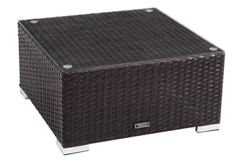 Descriptif : Table basse de jardin en résine tressée, idéale pour compléter un salon de jardin du même style - L'association de la résine tressée et de l'aluminium lui apporte à la fois de l'élégance et résistance.Structure : Aluminium/Polyéthylène (résine).Plateau : Verre trempé.Structure : Marron.Table : 62 x 62 x 30 - Epaisseur verre : 5 mm.Les + produit : Traitée anti-UV, anti-rouille et résistant à l'eau.Entreti