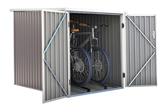 - Rails pour entreposer les vélos - Structure en acier galvanisé - Épaisseur paroi : 0.25 mm - Épaisseur structure : 0.5-0.8 mm - Résistant aux UV et à l'abrasion - Double porte avec verrou - Pas de fondation. Paroi : Acier galvanisé. Structure : Acier galvanisé. Paroi : Gris. Surface hors tout (m²) : 1.42 x 1.98 x 1.57 m. Extérieures : 1.28 x 1.89 m. Intérieures : 1.24 x 1.58 m. Faîtage : 1.57 m. Epaisseur paroi : 1
