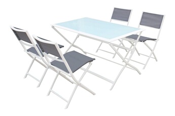 - Salon de jardin repas - Structure en acier - Plateau en verre 5 mm - Taille structure de la chaise : 38 x 19 mm - Capacité : 4 places assises - Table pliante - Chaises pliantes - Structure légère et résistant à la rouille .Structure : Blanc.Siège : Gris.Structure : Acier.Siège : Textilène.Plateau de la table : Verre.Table/table basse : 130 x 75 x 71 cm - Pieds : 30 x 15 mm.Chaise : 52 x 45 x 82 cm.Plateau de table