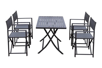 - Table de jardin repas - Parfait pour un coin repas dans le jardin - 1 table + 4 chaises - Table pliante - Structure en aluminium - Siège en textilène - Résistant à la rouille.Structure : Aluminium.Siège : Textilène.Plateau de la table : Aluminium.Table/table basse : 120 x 70 x 71 cm.Chaise : 55 x 45 x 85 cm.Les + produit : - Structure résistante - Résistance à la rouille - Table pliante - 4 Chaises fournies.Conseil