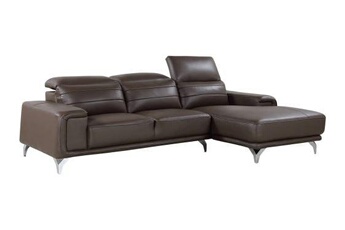 Descriptif : Canapé d'angle en cuir et en PVC - Appui-têtes réglables - Garni de mousse et de ressorts - Pieds chromés.Type : Fixe.Matière : Cuir.Couleur : Marron.Nombre de places : 4.Position de l'angle : Droit.Canapé : Cuir (assise et dossier) + PVC.Structure : Bois massif et contreplaqué.Assise : Garnie de mousse - Densité : 28 kg/m³.Dossier : Garni de mousse - Densité : 25 kg/m³ - Appui-têtes : Garnis de mousse -