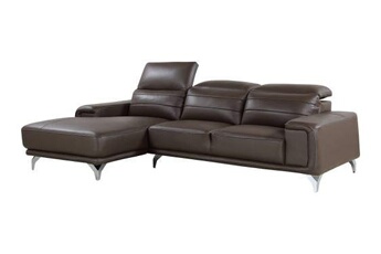 Descriptif : Canapé d'angle en cuir et en PVC - Appui-têtes réglables - Garni de mousse et de ressorts - Pieds chromés.Type : Fixe.Matière : Cuir.Couleur : Marron.Nombre de places : 4.Position de l'angle : Gauche.Canapé : Cuir (assise et dossier) + PVC.Structure : Bois massif et contreplaqué.Assise : Garnie de mousse - Densité : 28 kg/m³.Dossier : Garni de mousse - Densité : 25 kg/m³ - Appui-têtes : Garnis de mousse