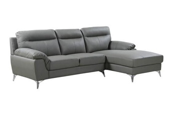 Descriptif : Canapé d'angle en cuir reconstitué et en PVC - Garni de mousse et de ressorts - Pieds chromés.Type : Fixe.Matière : Synthétique.Couleur : Gris.Nombre de places : 4.Position de l'angle : Droit.Canapé : Cuir reconstitué (assise et dossier) + PVC.Structure : Bois massif et contreplaqué.Assise : Garnie de mousse - Densité : 28 kg/m³.Dossier : Garni de mousse - Densité : 25 kg/m³.Suspension : Ressorts zig-zag