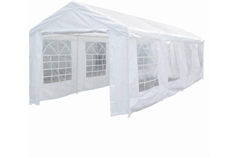 Tente de réception de jardin "Célia" - Dimensions : 890 x 290 x 270/200 cm - Blanc - Structure : acier - Toile : polyéthylène - Imperméable Description du produit Descriptif : Tente de réception Celia - 25.81 m². Structure/Matière : Structure : acier - Toile : polyéthylène. Couleur : Blanc. Panneaux : Panneaux avant et arrière : 100 g/m²Panneaux avant et arrière : 100 g/m² Toile : 140 g/m². Matière : Acier / Polyéthylène. Caractéristiques techniques Dimensions extérieures : 890 x 290 x 270/200 cmPanneaux avant et arrière : 890 x 290 cm Panneaux latéraux : 290 x 290 cm. Toiture : En pente. Pieds : 190 cm. Hauteur min/max : 270/200 cm. Surface : 25.81 m². Vitres : 8 fenêtres incluses. Type de couverture : Couverture amovible. Conseil Pratique : Système d'ancrage : clous et vis en acier, corde (polypropylène) Résistant aux intempéries. Colisage : 2 colis : - 2,41 x 0,23 x 0,2 m, 33,8 kg - 0,63 x 0,6 x 0,32 m, 23,6 kg. Poids : 56.4 kg. Forme : Rectangulaire. Garantie :