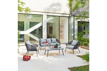 Design et sobre, ce salon de jardin pour cinq personnes apportera une notre de fraîcheur et d'élégance à votre terrasse. Sa structure en aluminium et ses mailles imitation corde tressée, sauront vous faire craquer au premier regard et feront de cet ensemble l'élément central de votre décoration. FICHE TECHNIQUE - Structure en aluminium. - Mailles en polyester. - Plateau de la table basse en verre trempé. - Salon de jardin idéal pour accueillir cinq personnes. - Composé d'un canapé trois places, deux fauteuils et d'une table basse. - Coussins déhoussables en polyester 210 g/m² traité déperlant. CARACTERISTIQUES TECHNIQUES - Dimensions des fauteuila : L. 70 x P. 73 x H. 70 cm. - Dimensions des canapés : L. 151 x D. 73 x H. 70 cm. - Dimensions des tables : L. 99 x D. 58 x H. 36 cm. - Hauteur assise : 31,5 cm - Poids : 33,6 kg.