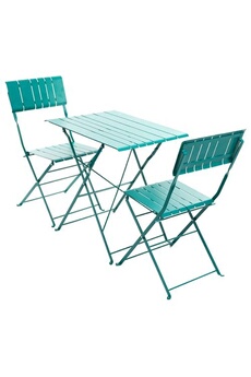 Design et chaleureuses, cette table et ces chaises apporteront de la couleur et du dynamisme à votre extérieur. Pliables, vous pourrez facilement les ranger à la fin des beaux jours. FICHE TECHNIQUE - Structure des chaises et de la table en acier. - Traitement antirouille avec peinture époxy et electrodéposition. - Résistantes aux UV. - Pliable, cet ensemble se range facilement. - Gain de place optimal. - Lot contenant une table et deux chaises. - Idéal pour deux personnes. CARACTERISTIQUES TECHNIQUES - Dimensions des chaises dépliées : L. 44 x P. 48,5 x H. 86,5 cm. - Dimensions des chaises pliées : L. 44 x l. 10,5 x H. 102 cm. - Hauteur d'assise : H. 44 cm. - Dimensions de la table : L. 71 x P. 52 x H. 71 cm. - Poids : 26 kg.