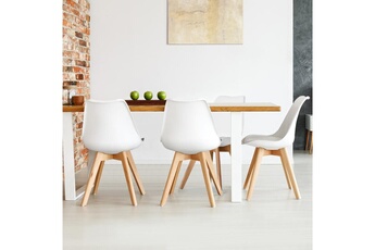 Avec leur design scandinave, ces 4 chaises ultra-tendances apporteront une ambiance à la fois contemporaine et chaleureuse à votre intérieur !Idéales dans une salle à manger, cuisine ou un bureau, ces chaises confortables trouveront forcément leur place dans toutes les pièces de la maison.Elles offrent un excellent confort d'assise avec leur dossier courbé en polypropylène et leur assise rembourrée.Le design nordique s'invite chez vous !Parfaitement stables, elles sont munies de 4 pieds en bois de hêtre aux finitions travaillées.Dimensions : L.48xl.60xH.80cmLargeur extérieure entre 2 piètements : 23.5/43.5 cmVendu en lot de 4 chaises coloris blanc.Egalement disponible en coloris NOIR