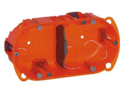 Boîte d'encastrement 2 postes - Marque Legrand - Pour tout type de murs - Boîte à rigidité renforcée - Fixation des interrupteurs et prises par vis ou par griffes - Equipées d'étriers métalliques imperdables - Emplacements permettant l'injection de colle ou matériaux de scellement - Diffusion de la colle visible par transparence