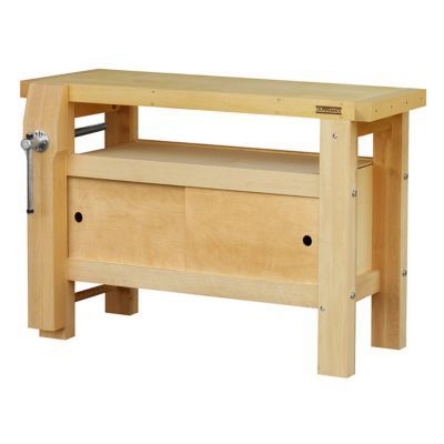 Plateau bois multiplis 60 mm avec ceinture bois massif 60 mm. Bâti bois massif avec piètement renforcé 100 x 60 mm. Caisson de rangement 116L utiles composé de : - 2 portes coulissantes l.530 x h.290 mm. Espace de rangement entre le plateau et le caisson. Presse avant verticale mâchoire bois, vis acier Ø 26 mm. Hauteur 800 mm, ouverture max 300 mm. longueur:1,20 m largeur:0,50 m hauteur:0,85 m poids:65 kg