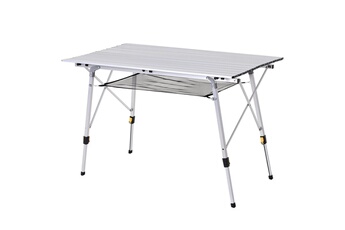 Cette table de camping pliante en aluminium vous permettra de manger jusqu'à 6 personnes très confortablement. Parfaitement adaptée pour le camping mais également pour le jardin à l'occasion d'un barbecue, repas ou fête, cette table deviendra vite indispensable. Pliable, de hauteur réglable, et fournie avec un sac de transport, vous pourrez la déplacer et ranger très facilement. Caractéristiques : - Table pliante familiale de camping : 6 personnes peuvent manger simultanément et confortablement - Poids net total de seulement 6,5 Kg : idéal pour les pique-niques, le camping mais également pour le jardin à l'occasion d'un barbecue, repas ou fête - Pliable et compacte, facile à transporter et à ranger (sac de transport fourni) - Hauteur réglable de 58 jusqu'à 73 cm - Plateau et cadre en aluminium : usage intérieur ou extérieur pérenne - Nouveau système de connexion des lattes par chaîne plastique sans espaces intercalaires : installation rapide sans outils ! - Filet de rangement pratique