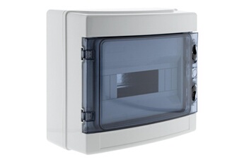 Coffret électrique étanche IP65 8 modules 1 rangée à équiper. Convient à une installation domestique idéal pour un atelier ou un abri piscine. Livré avec porte rail din métal 1 bornier de terre et obturateurs. Coffret électrique étanche IP65 8 modules 1 rangée à équiper. Convient à une installati
