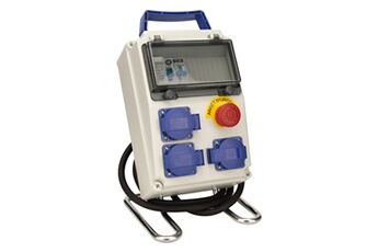 Coffret 8 modules de chantier IP54 PRÉÉQUIPÉ avec Rail Métal,+Obturateurs, avec 3 Borniers de connexion -avec porte fumée +EQUIPE DE :' 1 Inter. Différentiel 30mA 40A Type AC 1 disjoncteur 20A 3 prises modulaires 16A 2 pôles + terre avec fermeture à clapet 1 dispositif marche/arrêt d'urgence 1 cordon d'alimentation 2 mètres